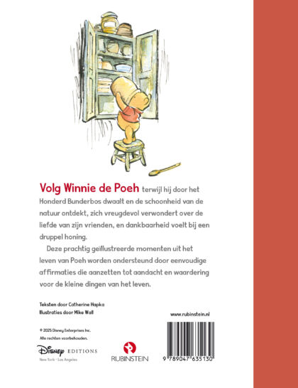 Volg Winnie de Poeh terwijl hij door het Honderd Bunderbos dwaalt en de schoonheid van de natuur ontdekt, zich vreugdevol verwondert over de liefde van zijn vrienden, en dankbaarheid voelt bij een druppel honing. Deze prachtig geïllustreerde momenten uit het leven van Poeh worden ondersteund door eenvoudige affirmaties die aanzetten tot aandacht en waardering voor de kleine dingen van het leven. Vertaald door Bette Westera.